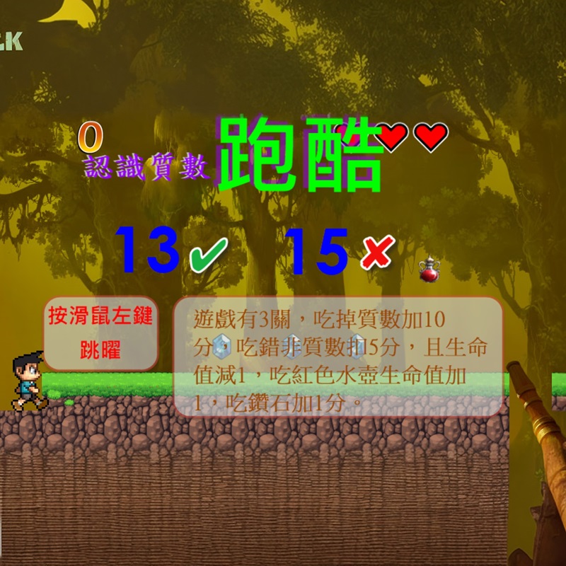 - 吃到「藥水」加1顆心,撞到「障礙物」扣1顆心、吃到「非質數」扣1顆心。